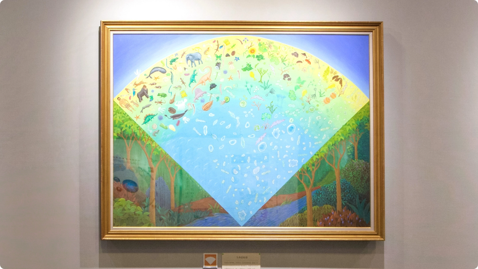 実際に現地に訪れたところ、入館してすぐに「生命誌絵巻」が迎えてくれました。これは、38億年の生命の歴史が色鮮やかに描かれた絵画で、人間もその一部として登場します。さらに、「生命誌の階段」では、壁面のイラストを見ながら一段進むごとに生命の進化をたどることができ、最後の一段には人間の姿が。他の展示物にも、私たち人間も生きものの一部であるというメッセージが込められ、来館者の感性や体感を通して伝わってくる仕掛けになっています。