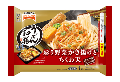 テーブルマークは、3種のおかずとうどんをセットにした「うどん和膳」シリーズより、「うどん和膳 彩り野菜かき揚げとちくわ天」を発売します。麺は国産小麦を100%使用し、彩り豊かな野菜かき揚げ、衣のくちどけにこだわったちくわ天、甘めのしっとり卵焼きを組み合わせた、満足感ある一品です。つゆはかつお節、にぼし出汁で香り高く仕上げました。