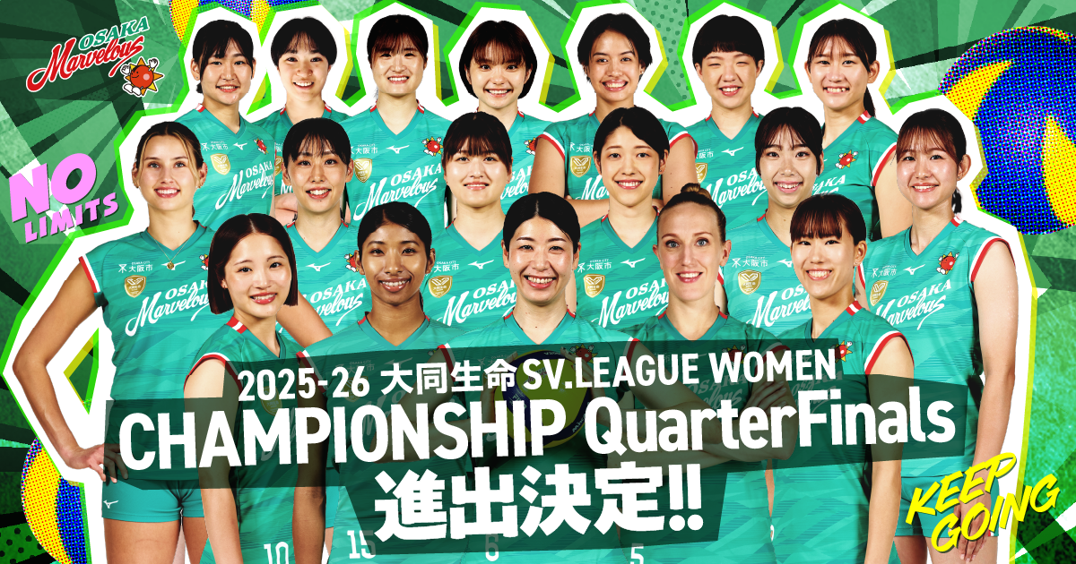 3月1日(日)の試合結果に伴い、大阪マーヴェラスのレギュラーシーズン8位以上が確定し、2025-26 大同生命SV.LEAGUE WOMEN CHAMPIONSHIP QuarterFinalsへの進出が決定いたしました。