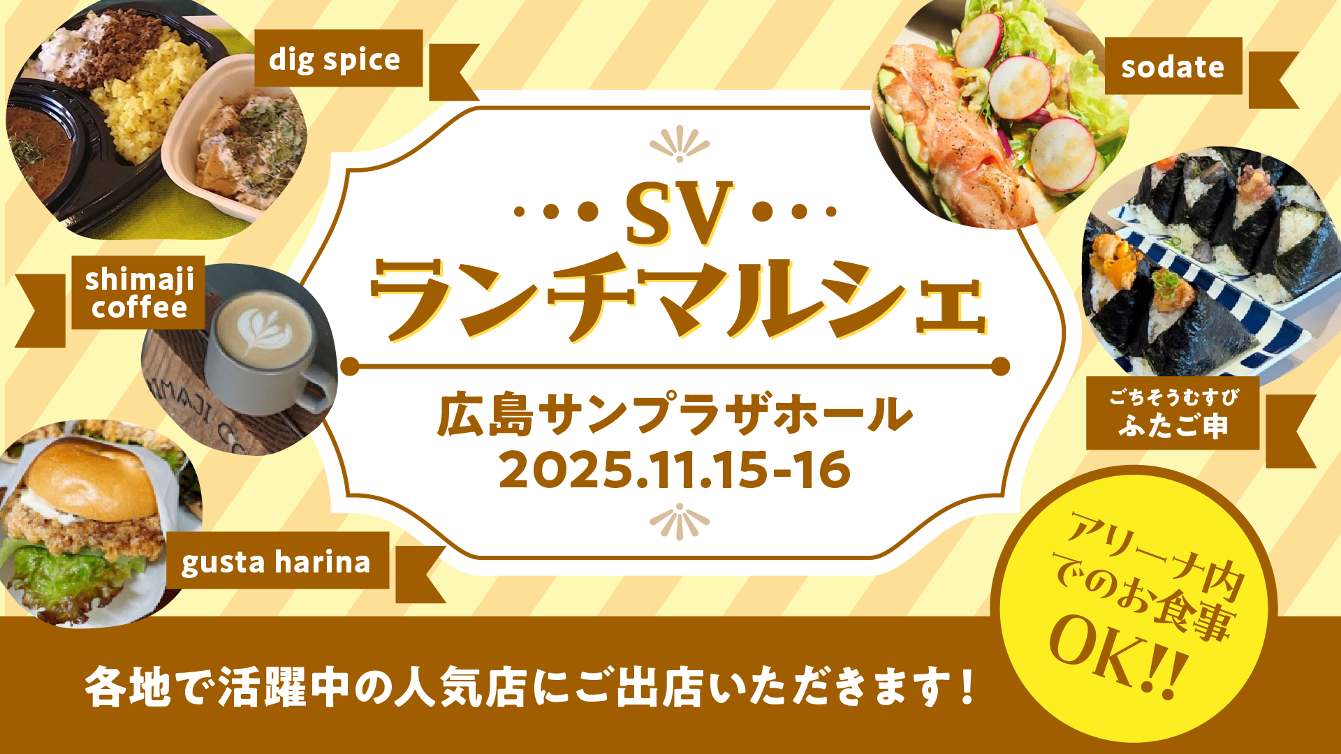 広島県内で人気の「dig spice」、「gusta harina」、「sodate」、「shimaji coffee」、「ふたご申」が出店!