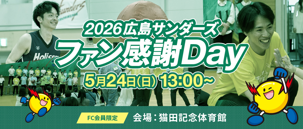 日ごろより、広島サンダーズへ温かいご声援をくださるファンの皆さまへ感謝を込めて、5月24日(日)に猫田記念体育館にて開催する「2026 広島サンダーズ ファン感謝Day」の参加応募受付をファンクラブ会員限定で4月6日(月)18:00より開始いたします。