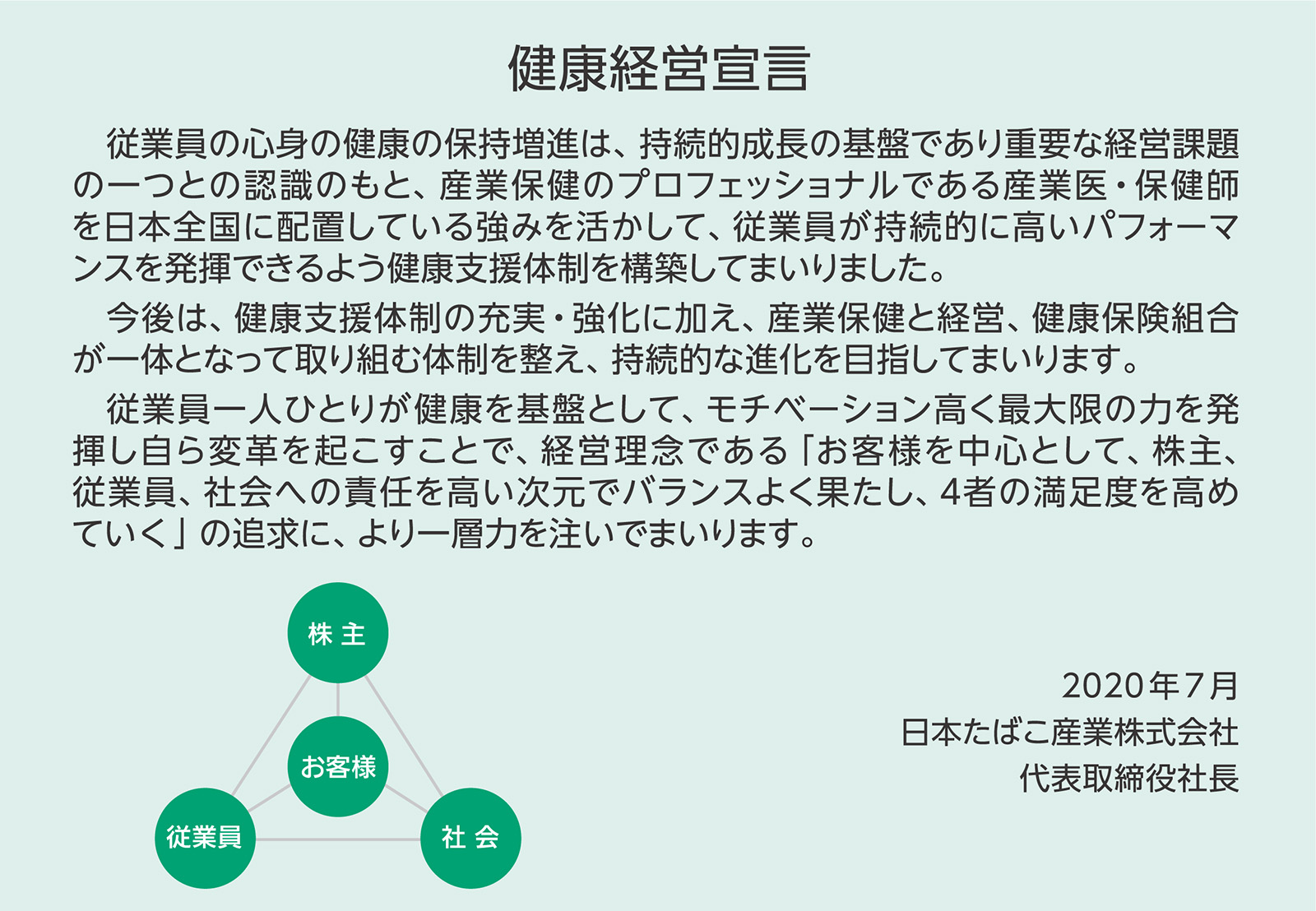 JTグループでは、経営理念である4Sモデルの中で重要なステークホルダーとして位置づけている従業員について、その一人ひとりの“心”と“体”が健康であることは、経営理念に基づく事業活動を行ううえで欠かせない要素であるとともに、会社の持続的成長の基盤であると考えています。